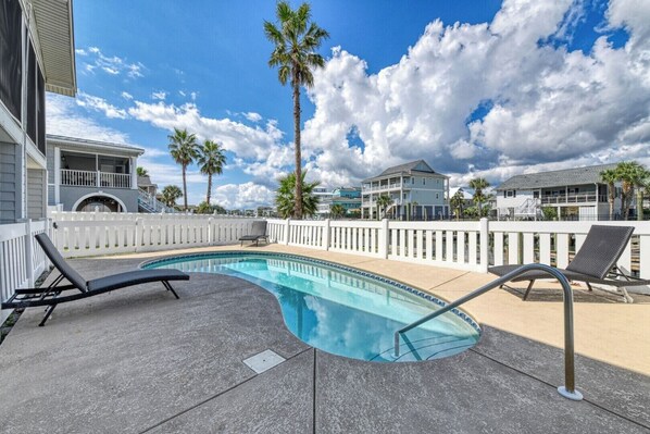 Rucker Cottage is een zes slaapkamers, drie badkamers strandhuis gelegen 2. 7 mijl ten zuiden van de Garden City Pier en een blok van het strand. Dit huis is voorzien van een volledig uitgeruste keuken met magnetron en vaatwasser, eethoek, wasmachine, droger, centrale verwarming en airconditioning, een plafondventilator en keramische tegels vloeren. Zeven flatscreen tv's (drie met HBO), twee dvd-spelers, telefoon en Wi-Fi zijn ook aanwezig. Slaapplaatsen zijn twee koning, een koningin en vijf dubbel-size bedden. Een 12-by-26-meter lang priv������������������ zwembad, gemeubileerd zwembad dek, afgeschermd terras, zonnedek, en drijvend dok completeren het outdoor leefruimte. Voldoende parkeergelegenheid (sommige overdekt). Niet roken. Geen huisdieren. Vertrek schoonmaakdienst inbegrepen. Linnengoed inbegrepen. Maximale bezetting: 16