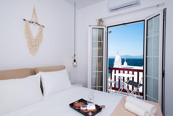 The three bedrooms have access to a traditional Mykonian balcony with Aegean sea view and the Windmills. The 4th bright bedroom features 2 windows with Aegean Sea views.