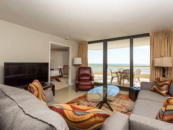 Welkom bij ons appartement aan de oceaan met de "2 miljoen dollar weergave". Unit F12 is volledig gerenoveerd en opnieuw ingericht vanaf maart 2018. Mooie tegelvloeren zijn geïnstalleerd in de flat, inclusief het balkon. De badkamers hebben nieuwe tegeldouches en nieuwe ijdelheid kasten. Het hele appartement is vers geschilderd van boven naar beneden en popcorn plafonds verwijderd. We hebben alle meubels in de woonkamer, eetkamer en beide slaapkamers inclusief matrassen vervangen. De oceaan woonkamer heeft een 12 ft. Glazen schuifdeur naar het balkon, 55 "Smart HDTV, een dvd-speler en een Bose Am / FM / CD-stereo. De nieuwe queensize slaapbank heeft een premium matras voor meer comfort. Het eetgedeelte biedt plaats aan vier aan de nieuwe tafel met een nieuwe tafel en twee aan de bar. De keuken is volledig gerenoveerd met nieuwe kasten, werkbladen en nieuwe roestvrijstalen apparaten. De keuken is volledig gevuld voor de chef-kok (of wannabe chef-kok) met mooi servies, kookgerei, bestek en een crockpot. Onze master bedroom aan de oceaan heeft nieuw tapijt, een 32-inch HDTV, een dvd-speler, een nieuw kingsize bed en matras, nieuwe meubels, waaronder een bijzetstoel en een poef en een computertafel en bureaustoel. De glazen schuifdeur naar de slaapkamer leidt naar een klein eigen balkon met een tafel en twee stoelen. Het aangrenzende grote bad heeft een dubbele ijdelheid met een grote inloopkast. De kamer aan de oceaan heeft nieuw tapijt, een nieuw queensize bed en matras, 2 nachtkastjes, een bureau en een stoel en een 28-inch Smart HD-tv. Het aangrenzende complete badkamer heeft een nieuwe ijdelheid en betegelde douche. De zes voet glazen schuifdeur in de kamer opent naar het grote balkon. Het grote balkon aan de oceaan heeft een tafel en 4 stoelen om buiten te eten en een chaise longue. Er is een nieuwe HVAC geïnstalleerd. Het uitzicht vanuit ons appartement is gewoon ongelooflijk. We weten dat u vele uren op ons grote balkon zult genieten van het uitzicht op de oceaan. Bel of mail voor meer informatie. Opmerking- F12 heeft een zeer unieke plattegrond - beide slaapkamers liggen aan de oceaan en dit appartement heeft twee balkons!