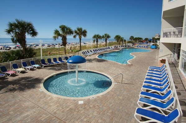 DIT BEACHFRONT, FULL-SERVICE vakantieoord compleet met on-site winkels en restaurants. U vindt een uitgebreide reeks waterpartijen voor urenlang familieplezier - buitenzwembaden en overdekte zwembaden voor alle weersomstandigheden, kinderzwembaden, whirlpools en een lazy river allemaal in een aantrekkelijke tropische tuinomgeving.