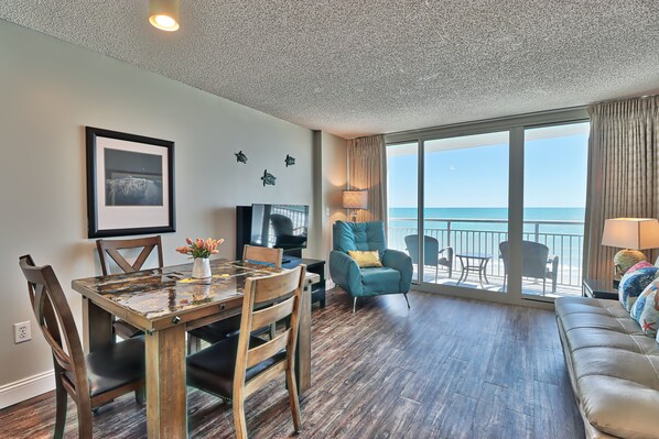 Onlangs gerenoveerd schoon en comfortabel Modern 1 slaapkamer appartement (slaap 8) is gelegen in het centrum van Myrtle Beach. Voel je vrij voor alle Jennifer (929-515-0422) voor boeking en details. Het ligt op slechts een steenworp afstand van het pretpark Family Kingdom, The Boardwalk en Splashes Water Park. Geniet op het balkon van het prachtige uitzicht en de bries van de Atlantische Oceaan. Deze suite beschikt over 2 queensize bedden in de privéslaapkamers en 1 queensize opklapbed in de woonkamer met kamerhoge ramen, een direct balkon aan de oceaan, een complete badkamer en een complete keuken.
