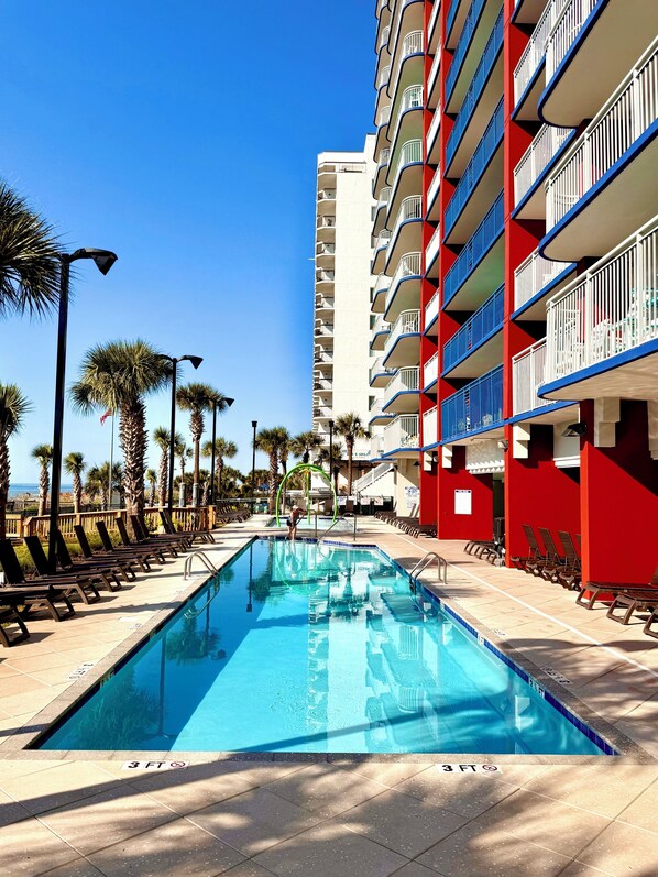 Bovendien is de Grand Atlantic een van de weinige resorts aan de oceaan die toegang biedt tot een afgesloten gang naar elk appartement. Bij slecht weer kunt u uw appartement verlaten, een lift nemen naar de benedenverdieping en toegang krijgen tot het prachtige binnenzwembad, het nieuwe bubbelbad, het binnenzwembad voor kinderen, de luie rivier, de speelkamer en het fitnesscentrum zonder ooit een voet in de buitenlucht te stappen! Als het weer slecht is, kunnen uw kinderen nog een leuke dag beleven aan onze overdekte waterpartijen.