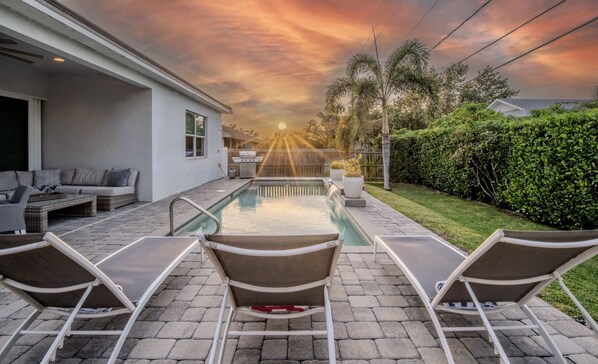 Soak up the Naples sunshine in the private backyard featuring a heated pool and spacious outdoor seating. Whether you’re lounging poolside with a book or gathering for conversations, this outdoor area is designed for relaxation.