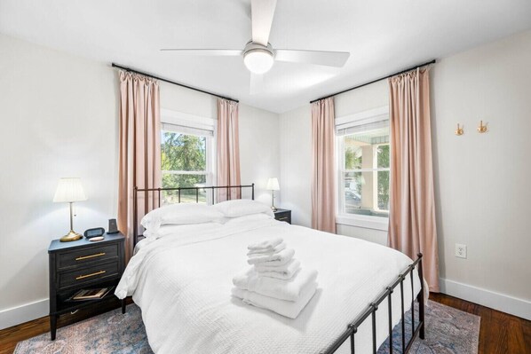Discover the Garden Suite, a brownstone-inspired retreat featuring the fourth bedroom with a plush queen bed (sleeps 2) and the third bathroom with a spa-like walk-in shower.
