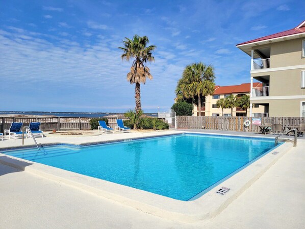 This cute, ground floor studio condo is perfect for a couples retreat or a small family getaway! Located directly on the Santa Rosa Sound the views from the patio are stunning. There is also a well maintained lawn off the patio. Perfect for the kids to run and play.