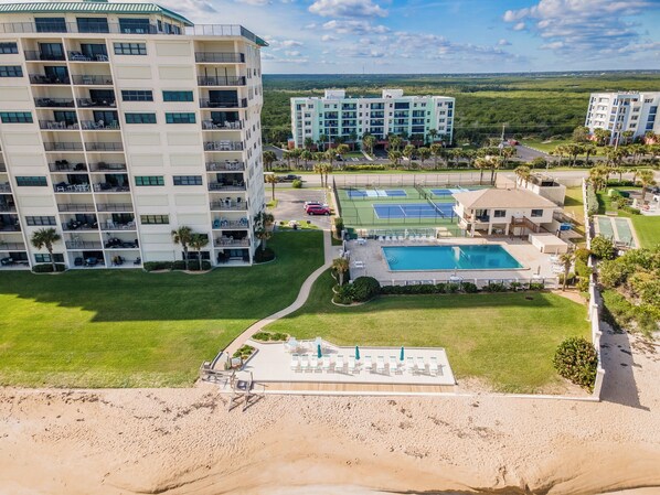 The Southwind, known as "one of the best buildings on the beach," has recently undergone a $1 Million renovation. A state-of-the-art entry gate system has just been installed, making this one of only a few facilities on New Smyrna Beach with restricted, gated access. The oceanfront pool is seasonally heated and you'll find plenty of lounge chairs, both inside the gated pool deck and out on the beachfront sun deck as well. In addition, high speed wireless internet access is now available for all guests so you can stay connected to the outside world while listening to the soothing sounds of the ocean waves. Follow the sidewalk to the beach access stairs and take in the panoramic Atlantic Ocean view. This complex is also equipped with tennis, basketball and shuffleboard courts.