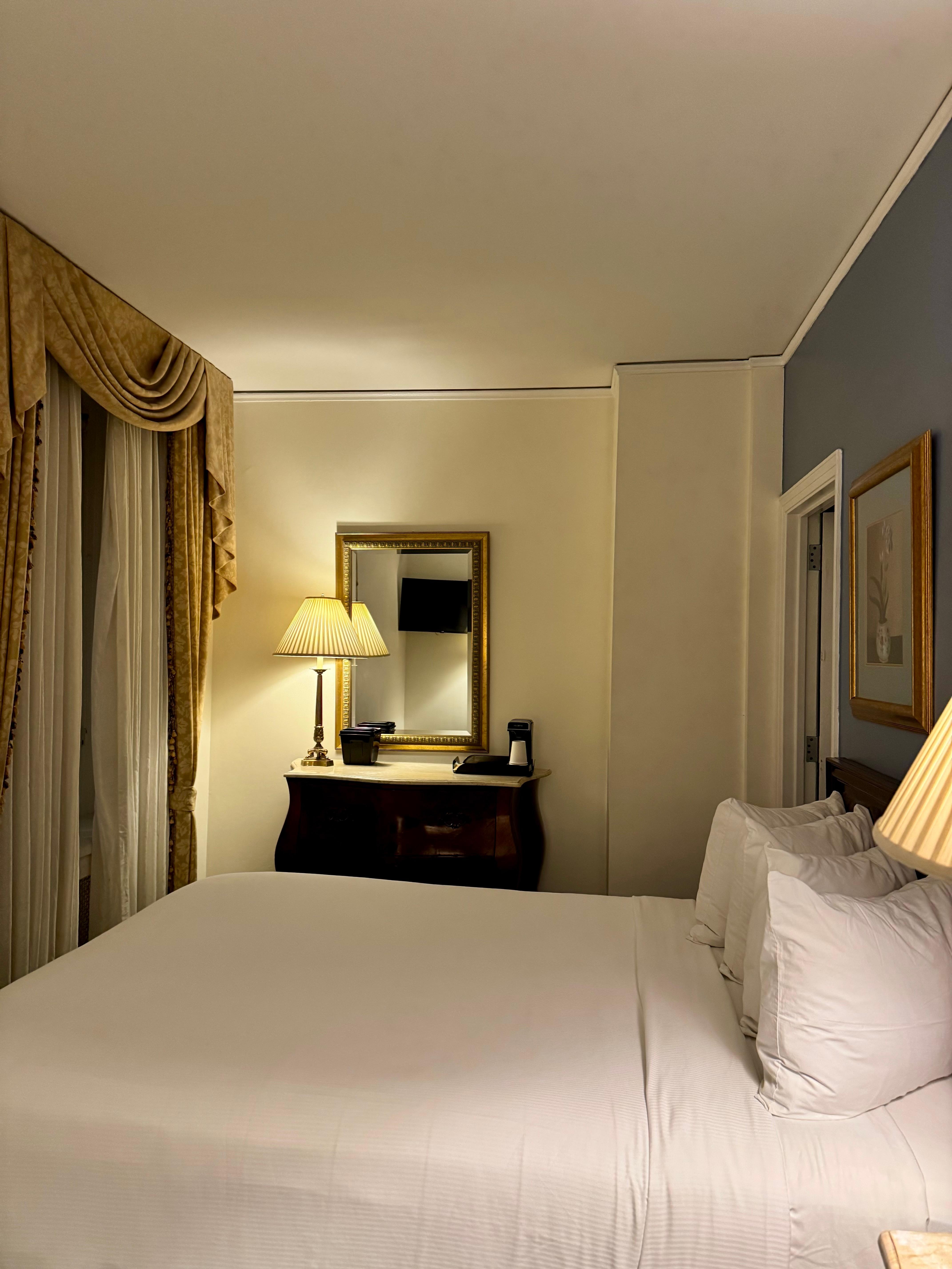 This is a little gem in the middle of Manhattan. It is a historic building and I wished the restaurant was open so I could see it. My only complaint is that the room was cold and there was no way to adjust the temperature. There was a split unit on the wall but it clearly stated it only worked for the a/c. I was on the only room on the 5th floor, with various locked doors that were probably for storage and there are large pieces of furniture also for storage. It was a little unnerving but I was glad to see a camera up on the ceiling. Overall, I hope to return one day.