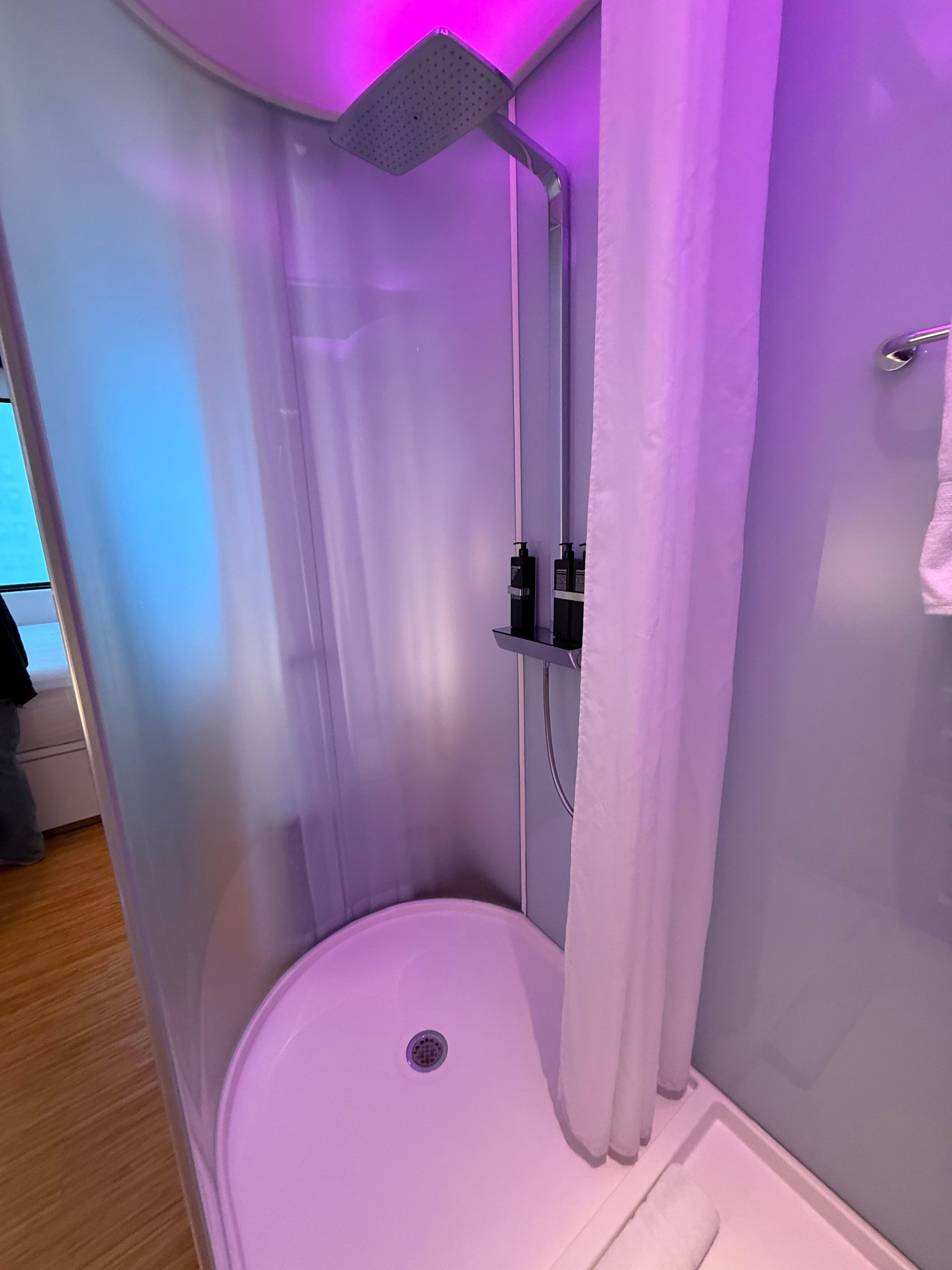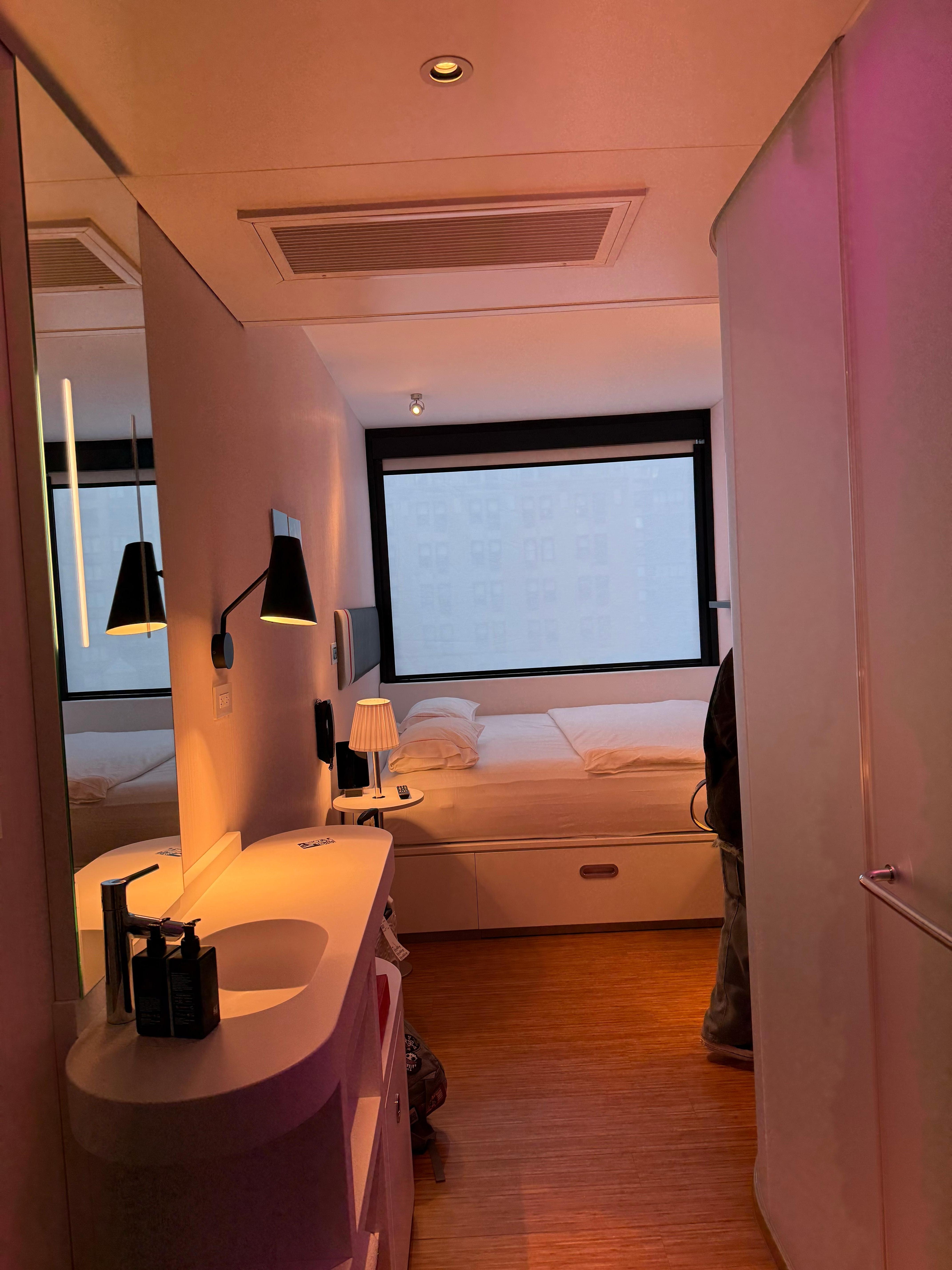 Citizen M should lead with the fact that rooms are 150 sq. Ft. The entire room width is the length of a king bed. VERY cramped for 2 people. No coffee makers in room, 1 chair, closet too small for a suitcase. Lights, curtains, TV, controlled by an iPad but half of wall switches didn’t work; we could control the color hue of room lights (red, blue, etc) but it was all or none even if we walked to each outlet. 24 hour cafe is a spendy breakfast buffet with few vegetarian options (cold potatoes or breads) or premade salads and sodas in a fridge. 1 working elevator for most of our stay. I lead with the bad because these things were each extraordinarily difficult; esp. room size. One of us literally had to turn sideways for the other to pass in room with desk, sink, and toilet area all jutting in to the narrow (80 inch / 6.6 feet) width. Finally, for half our stay, water in shower was warm at best.