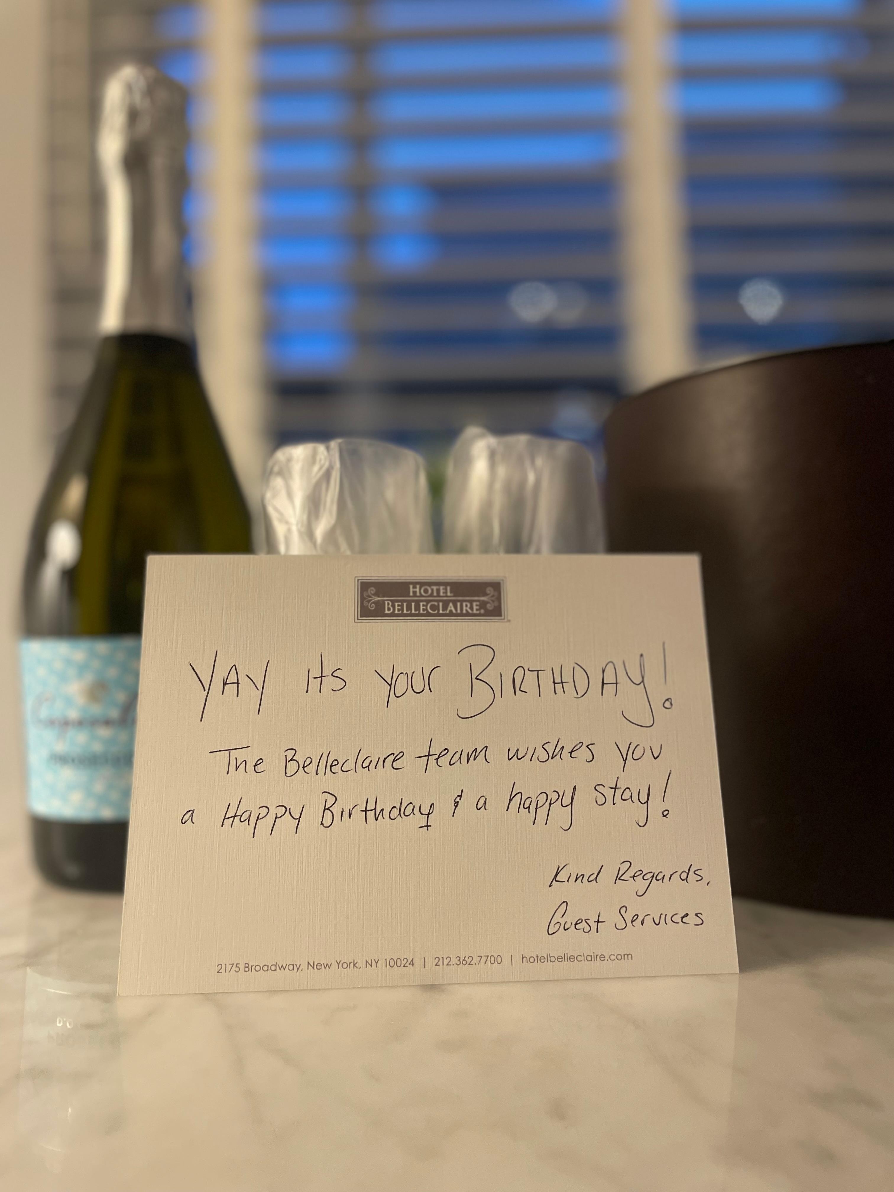 Everything was perfect they even kindly gave me a bottle of champagne for my birthday! Thank you !!!!!!