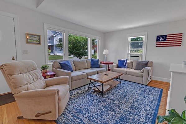 This was a great stay for seven adults. It was even more homey than it looks in the pictures -- clean, well-stocked, and comfortable! The kitchen (especially the stove/oven) is a bit small but it still had everything we needed to cook a seafood dinner, and either the hosts or other guests had left some basics like coffee pods and condiments. We really enjoyed sitting on the back porch at all times of day. The beds were very comfortable, and there were extra blankets throughout the house. The neighborhood is quiet but there are restaurants within walking distance -- we loved Flo's! -- and the drive to Newport's wharf area was quick (though trafficky on the weekend). I hope I can come back again someday!