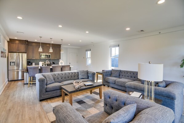 Dit onlangs gerenoveerde luxe derde verdieping unit is gelegen in het historische Washington Square vlak bij Broadway en op enkele minuten van de prachtige binnenstad aan het water. De open plattegrond creëert een perfecte setting voor u en uw gasten om te verzamelen! De woonkamer zit comfortabel 8, biedt centrale AC / Heat en een flatscreen-tv en grenst aan een volledig bijgewerkte keuken met een groot eiland, roestvrijstalen apparaten en is volledig gevuld met kookgerei. U hebt ook toegang tot een in-unit IPad waar u alle informatie over onroerend goed, nieuws over Newport en dingen die u in de stad kunt doen, vindt. Een van de twee banken kan worden uitgetrokken tot een queensize bed en biedt extra slaapplaatsen voor maximaal twee gasten.