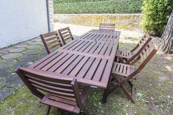 Beschrijving: gerenoveerd in meubels en met airconditioning net geïnstalleerd!begane grond van villa. Grote woonkamer met eettafel en eenpersoonsslaapbank - onafhankelijke keuken met wasmachine - slaapkamer met tweepersoonsbed - tweede slaapkamer met stapelbed - badkamer met douchecabine - grote omheinde privétuin voorzien van tafel, stoelen en barbecue om te eten. Dubbele privé parkeerplaats in de woning.