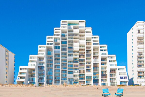 You'll have a front-row view of the beach, the Atlantic Ocean, and the building's outdoor swimming pool at Pyramid 1K, a two-bedroom, oceanfront condo in midtown Ocean City.