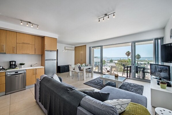 Het moderne appartement is volledig uitgerust en uitgerust en bestaat uit een ruime en op het zuiden gelegen woonkamer met eethoek en keuken, alles in open ontwerp. Voor de woonkamer heeft u een ruim terras met tafel en stoelen; ideaal voor ontbijt / lunch / diner en om te genieten van het adembenemende uitzicht. Vanuit de woonkamer leidt een gang naar twee tweepersoons slaapkamers, beide met ingebouwde kasten, twee moderne badkamers (een en-suite) met douche (een met douche en bad). Alle kamers beschikken over airconditioning (koeling en verwarming).