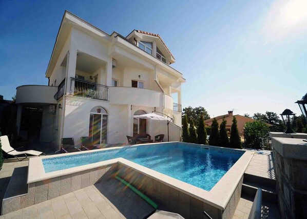 Nieuwbouw Villa met verlichte zwembad, een verreikend uitzicht op zee, drie terrassen en comfortabel interieur op een rustige locatie. Dit moderne, nieuw gebouwde familie villa is gelegen boven de badplaats Opatija, in de buurt van het wildlife park Ucka en de noordoostelijke punt van het schiereiland Istrië. Je bent weg van het centrum van Veprinac in een rustige locatie in een woonwijk met verspreide villa's. Op het terrein profiteert u van het zonnige en verhoogde positie met een prachtig uitzicht op de Kvarner baai, het eiland Cres, Cres en Krk. Dit vakantiehuis is ideaal voor een vakantie van bevriende families of groepen vrienden. Op een vloeroppervlakte van 234 m2, gelegen villa is gebouwd in 2012, verdeeld over drie verdiepingen. Zij kreeg de toestemming om vier-sterren categorie door het ministerie Toerisme. Binnen kunt u genieten in aanvulling op de royale toewijzing interieurs, hoge claims is een combinatie van gezellige en moderne elementen van een vakantie. Het hart van de Hausses de begane grond, die wordt gekenmerkt met een ruime woon-eetkamer en geïntegreerde keuken tot 78 m2, en een ruime badkamer. Op dit niveau krijg je twee buitenste deuren naar het terras en het zwembad. De eerste verdieping biedt twee slaapkamers met een tweepersoonsbed, en een badkamer. Vanuit beide slaapkamers komt u in twee balkon terrassen met uitzicht op zee. De bovenste verdieping is vergelijkbaar met de volledige oprichting van een onafhankelijke appartement. Dus, een grote slaapkamer met tweepersoonsbed en een eenpersoonsbed, een woonkamer met een slaapbank, een kitchenette en een eethoek, en een derde badkamer beschikbaar. Je hebt ook toegang van daar naar het dakterras met uitzicht op zee. De plaats Veprinac kenmerkt een oude mountain vesting van de Middeleeuwen. Opatija is al sinds de 18e eeuw. Eeuw een populaire toeristische bestemming en beroemd om zijn prachtige architectuur en de vele parken. Ontdek de kwaliteit gastronomische aanbod van de regio en de paden (rechts buiten de deur geopend) in het natuurpark Ucka. De hele stad is een prachtige mix van de kust en berglandschap genaamd de Kroatische Monte Carlo. Kruidenier, evenals cafés in Veprinac (800 meter). Van daar, een stad bus naar Opatija naar het strand leads (7 km). Restaurants zijn binnen 2. 3 kilometer. Een grotere supermarkt ligt op 5 kilometer. Het strand heeft tal van activiteiten zoals bananen paardrijden en mogelijkheden van watersport. Als u wilt rijden op vakantie, het vinden van een manege in het natuurpark Ucka, op de Runch Bubac, na ongeveer 8 kilometer.