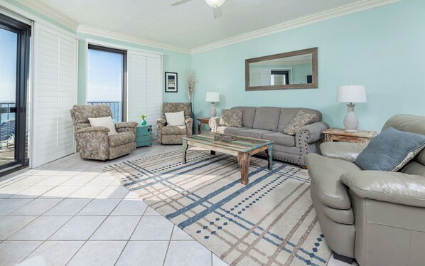 The great room also will not disappoint. The gathering area with nine-foot ceilings, has new premium furniture: a Best Craft pull-out sleeper sofa with excellent support, two Lazy Boy recliners, a comfy, large leather chair, The large wall mounted TV with cable and streaming services has a front mounted audio system. (All four TVs are wall mounted and streaming ready along with 2 DVDs) [And don’t forget the beautiful gulf views right outside. The 11th floor gives an expansive view of the gulf. The deck has new upscale furniture for your outdoor eating or viewing pleasure.