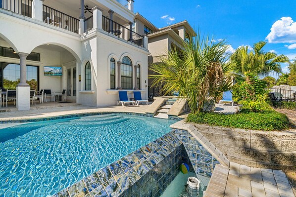 De outdoor woonkamer heeft alles, een grote overdekte eethoek, gebouwd in de zomer keuken, tiered loungen gebieden, een infinity edge zwembad en spa, voorzien van open pit, en op een verhoogde positie met uitzicht op de natuurlijke vijver en het behoud. Het leven is niet veel beter!