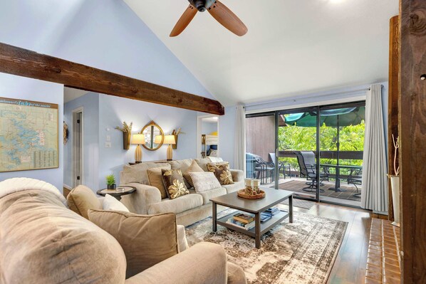 The home’s sparkling interior comes expertly furnished to enhance your relaxation and connection with loved ones, where soaring vaulted ceilings add to the spaciousness and help illuminate the room in bright, natural light. Recline in plush sofa seating in the living room, streaming all your favorite shows and movies on the mounted smart TV. The open floorplan flows you into the well-equipped kitchen, ready to assist with all your mealtime endeavors with full-sized appliances and ample countertop space and cabinetry for prep and storage. Gather for formal dining at the table for 6 or snag a high-top stool at the counter for hors d’oeuvres or a quick breakfast on the go.