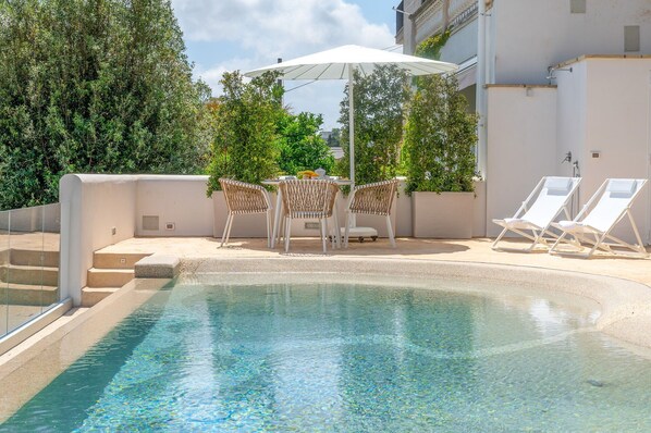 A beautiful private pool dominates the surrounding landscape, offering a stunning view of the Ostuni coastline. Sun-loungers and umbrellas invite you to unwind and soak up the sun.