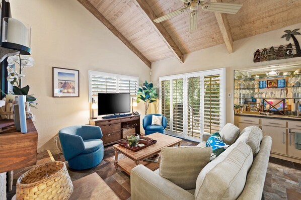 Woon / eetkamer grote kamer met hoge open balken houten plafonds, gashaard, slimme HDTV met digitale kabel inclusief HBO, Showtime, plus Netflix en HuluPlus (plus DVD). Met een Bluetooth-geluidsbalk kunt u uw eigen muziek afspelen vanaf uw smartphone. Een queensize slaapbank biedt op verzoek twee extra gasten.