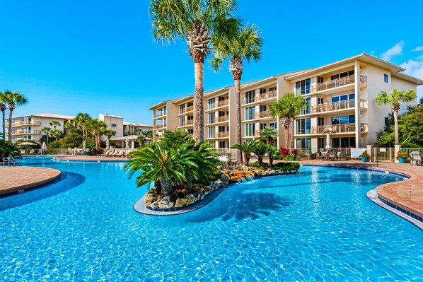 Dit mooie appartement met drie slaapkamers en drie badkamers op de vierde verdieping biedt een geweldig uitzicht op het zwembad in lagunestijl en over de horizon van de Golf van Mexico. Met een kingsize bed in de slaapkamer, een queensize bed in een gastenslaapkamer, evenals een queensize bed en een tweepersoonsbed in de extra gastenslaapkamer, biedt dit apparaat plaats aan maximaal zeven gasten comfortabel. De volledig uitgeruste keuken en woonkamer met casual meubels bieden een open concept met veel ruimte voor het hele gezin. Geniet van het geweldige uitzicht op High Pointe vanaf het privébalkon.