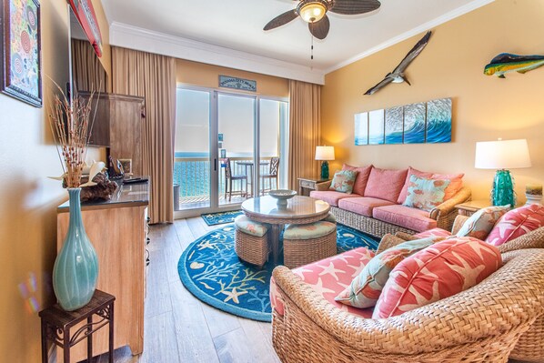 Calypso 2-2304W is an updated 3BR/2BA BEACHFRONT Penthouse, beautifully decorated with colorful coastal decor and lovely furnishings! You 'll be in the perfect location right beside Pier Park, so you can enjoy a vacation that is as relaxing or exciting as you want! This 23rd floor condo boasts a lovely kitchen with stainless steel appliances, a washer and dryer, updated flooring, and endless views throughout. Also, HBO is included in the TV cable package! With a king bed in the master, a queen bed in the first guest room, and a twin over full in the second guest room this beachfront condo sleeps 7 guests comfortably. Have your morning coffee on the Gulf Front balcony with endless views of sugar white sands and emerald waters!