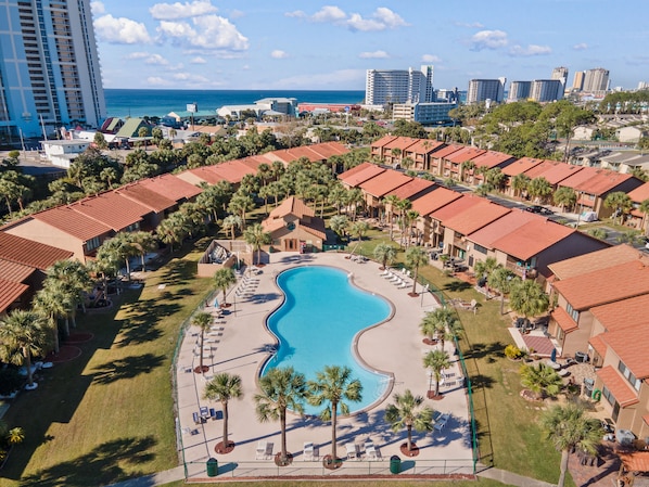 FIVE PALMS is conveniently located just a short 5-minute walk to the beach where you will step onto the sugar-white sand and into the stunning emerald waters that Panama City Beach is most famous for. Great dining, family amusement attractions and many shopping options are nearby on Thomas Drive and at the famous Pier Park shopping center. There are three public fishing piers to visit as well as the acclaimed Saint Andrews State Park. This park features awesome beaches, sand dunes and nature trails where you can see wildlife in its natural habitat. You might even see an alligator! The Lyndell Center is just 10 minutes away by car with FREE daily pickleball play on 4 dedicated outdoor courts. The Publix grocery store is about a mile away, and the Walmart Supercenter is within walking distance.