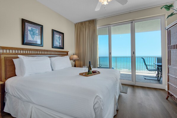 -Master slaapkamer heeft een kingsize bed en een flatscreen-tv en een uitzicht op de golf met toegang tot het balkon