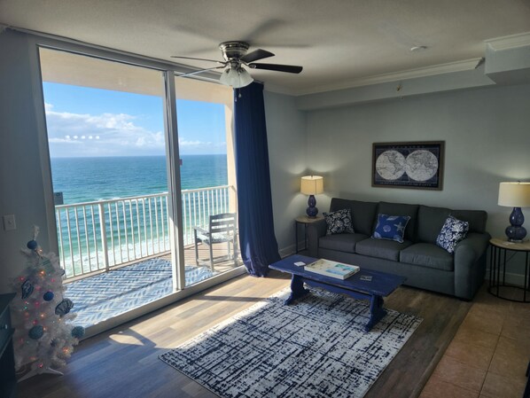 * Grote woonkamer met uitzicht op de Golf en een volledige slaapbank