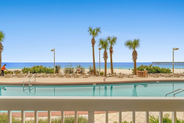 This beautiful, ground floor, two bedroom with two Full baths and Twin over Twin bunks in Bonus room, non-smoking condominium will spoil you. You will find all the comforts of home! The kitchen comes fully equipped with everything you need to spoil your family and friends. This condo is a 1226 sq.ft condo located on the ground floor of Calypso West and is .25 miles East of Pier Park. No need for elevators! This kitchen has granite counter tops and is equipped with everything you will need. You will feel welcomed as you walk into a spacious living room and dining area complete with all the comforts of home. The dining area will seat four. Additionally, we have three bar stools at the kitchen bar for extra seating! The living room and dining area provides ample space with spectacular ground floor views of the gulf! The granite wet bar with a separate sink from the kitchen is a must! You can make those cold beverages after those long hot days on the beach. You may prefer to sit on your furnished balcony and watch the auburn sunsets over the gorgeous gulf waters! This unit offers a large laundry room with a full size washer and dryer! The private master suite offers a romantic setting with gorgeous decor. You will enjoy your private sliding glass door that leads to the pool-side balcony. Watch the ocean waves from your king size bed. The master bathroom is truly first class! It has granite counter tops and double vanities. The guest suite has a luxurious Queen size bed! This suite has its own entrance to the second bathroom with granite counter tops and walk-in shower as well! The third bedroom has a twin over twin bunk! A perfect room for the kids! They will love having their own room!