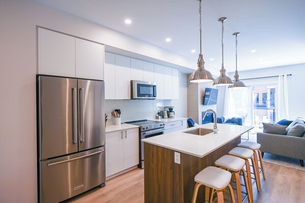 Enjoy the open concept living, kitchen, dining area located on the second floor. Curl up on the sofa by the fire or pull up a stool at the kitchen bar to catch up on the day.