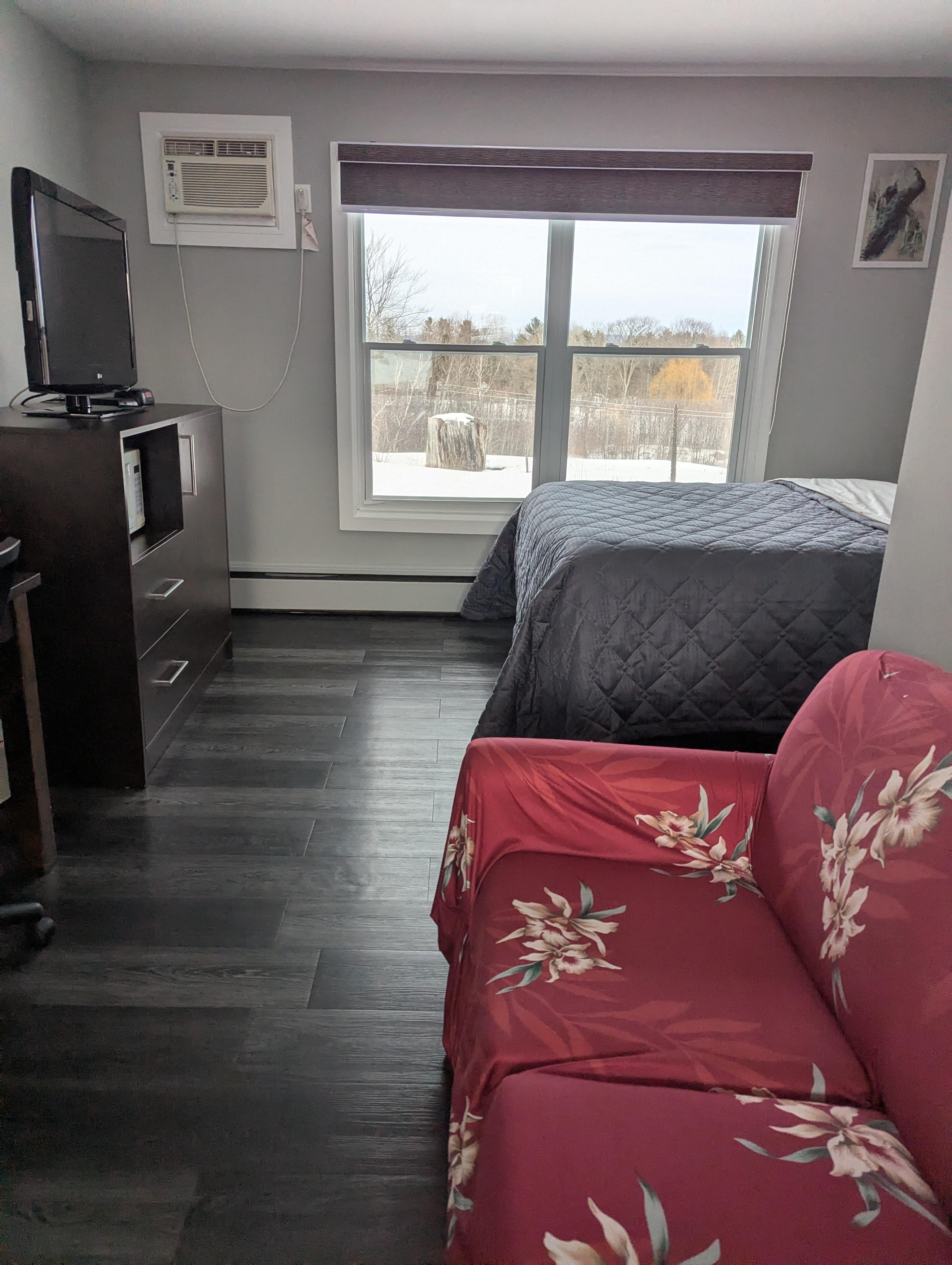 Clean room, comfortable queen mattress, bathroom is updated and was fresh. There was a small portable heater that was perfect for just adding a small amount of heat during the evening. There was a microwave, small refrigerator, tv( did not even turn it on) and wifi, luggage rack, love seat, 4 cup coffee pot and supplies. Mobility friendly except the two steps to check in at the office. Friendly couple for our check in and check out. Just heads up checkin has to be done before 730pm according to my email. Would stay here again, great value for a very affordable cost. And close(10ish minutes) to Petawawa's amenities.