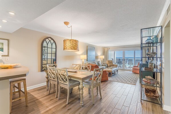 1219 SF of Living Area and a 200 SF private beach front balcony Luxury Faux wood flooring throughout Sandy Key 516 Features: Beds: Master - King, Guest – 1 Queen and 1 Twin with Trundle Bed, Queen Sofa Sleeper Modern, Fully-Equipped Kitchen with Keurig and Regular Coffee Maker Walk in shower in Master Bath In-Unit Washer and Dryer Bed Linens-Bath Towels Provided Electronics include 55 in Smart TV in Living Room with Roku, 32 in Smart TV with Roku in Master Bedroom, 21 in TV in Guest Bedroom Wireless Internet Non-Smoking No Pets 2 parking passes Group Accommodation Options Book both Sandy Key 516 and Sandy Key 515 to enjoy exclusive use of these side-by-side neighboring condos. When booked for the same dates of stay, these premier Sandy Key condos offer large group vacation rental accommodations for up to 12 people with 4 bedrooms, 4 bathrooms, 2 well appointed kitchens, and plenty of access to all the amenities throughout the Sandy Key Condos. Enjoy space AND privacy for your large group by booking both these vacation properties today!