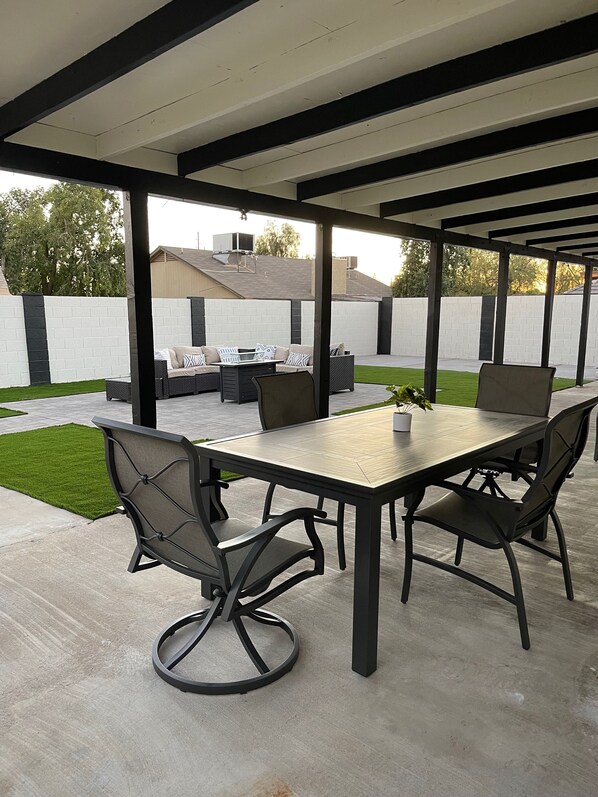 The house has a beautiful backyard with an outdoor setting and a fireplace to enjoy the night skies that Arizona has to offer. The backyard comes with 2 lime trees and a long concrete passage for plenty of parking space.