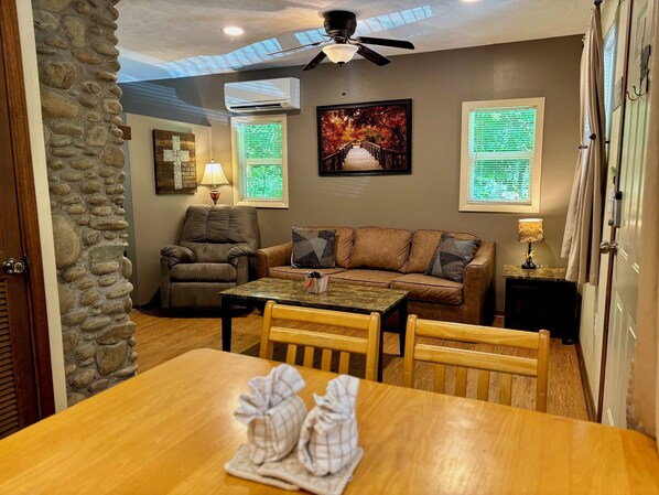 My family and I had a great stay here. The cabin was clean and neat, however the sofa is pretty worn out, and the mattress wasn't the best, so we weren't able to use the bed portion of it. The hot tub was a nice way for the wind down of the evening and to just relax after a long day. The location is great for just being about a mile or so off of Teaster Lane. Be advised though, you are about 1/4 of a mile from a landfill, and it can be pretty stinky at certain times. That was my one and only main complaint. Other than that we had a great time, and loved not having to stay in a hotel, but being able to still cook and chill out when we didn't want to be running around.