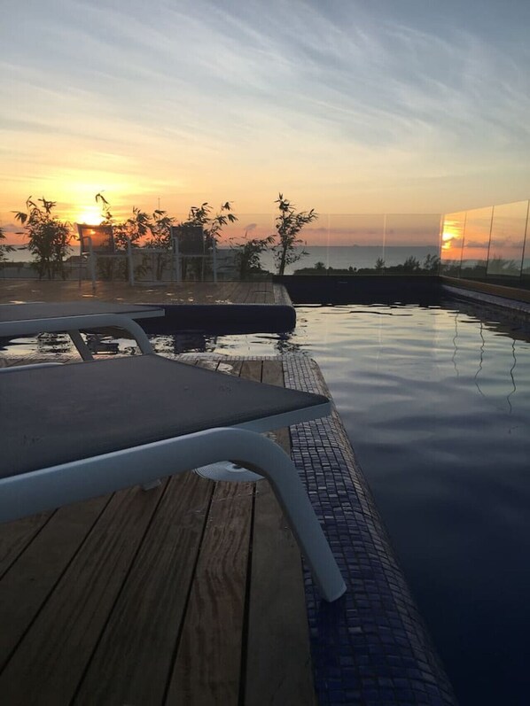 Zwembad in de adembenemende daktuin met lounge-terras, grill en eethoek.