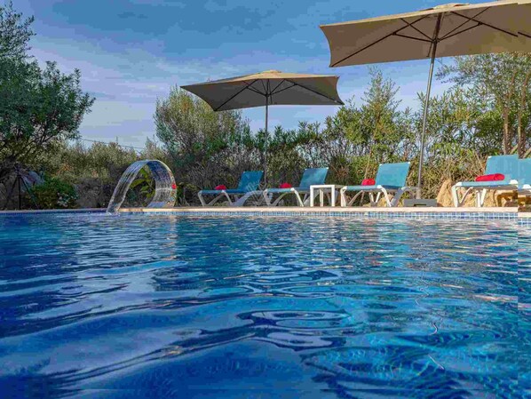 Buiten een aangename veranda ingericht met een grote tafel, tuin, 8x4 zwembad omgeven door gras en zonneterras met ligbedden en parasol, buiten badkamer met douche.