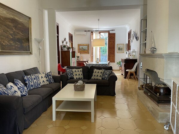 - Woonkamer (banken en tv) en een eetkamer voor 8 personen.