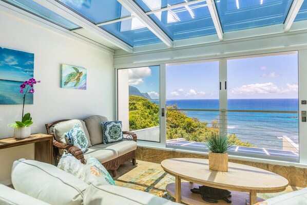 The light-filled glass-enclosed atrium as well as the private lanai off the living room are perfect spots to watch whales (Dec-Apr), dolphins, tropical birds, sailboats, rainbows, surfers --or curl up with a good book on one of the comfy sofas or outdoor lounge chairs with two market umbrellas to keep the shade a-plenty. In the evening, use the gas BBQ to grill while watching Kauai's mesmerizing sunsets over the Pacific ocean and majestic Bali Hai.