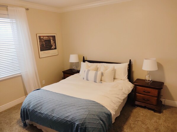 This newly finished, spacious, open floorplan basement apartment is in a safe, quiet, upscale Pleasant Grove neighborhood. It sleeps four with a king bed in one bedroom, a queen in the other, and 1.5 baths. Each bedroom also has a large-screen TV.