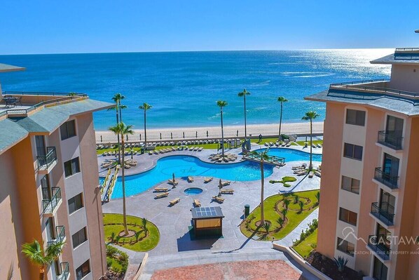 Truly beautiful one bedroom one bath condo has an occupancy of 2 adults and 2 children in the luxurious Sonoran Spa Resort on Sandy Beach. Here you will find everything you need for your enjoyable vacation all nicely furnished and decorated. Beautiful kitchen. Nice dining area and living room with Flat Screen TV and views out to the sea through the large double glass doors. Large Master Bedroom with access to patio area. Separate shower with 100% cotton towels. Excellent Ocean views over lush common area pool from the patio.