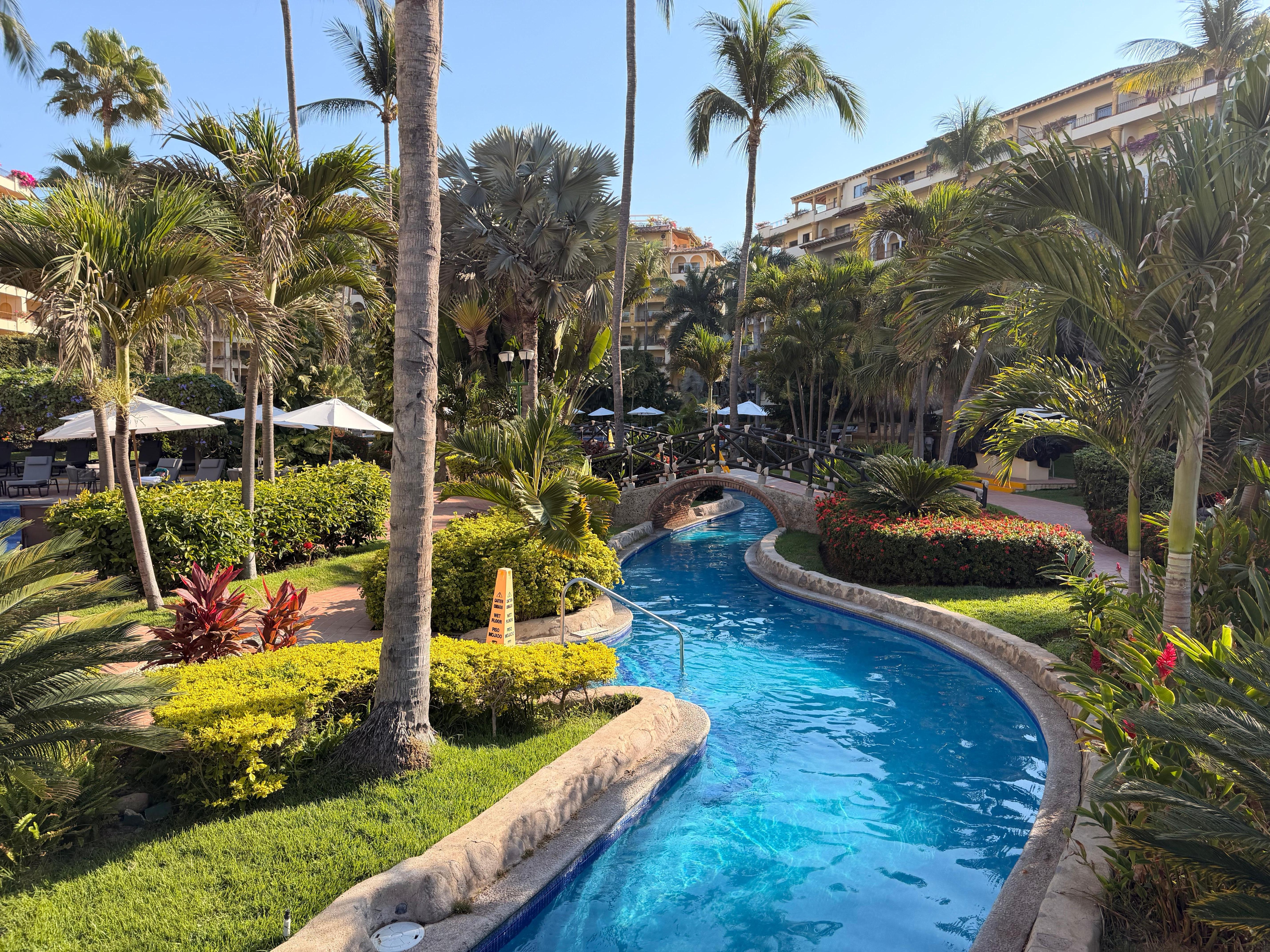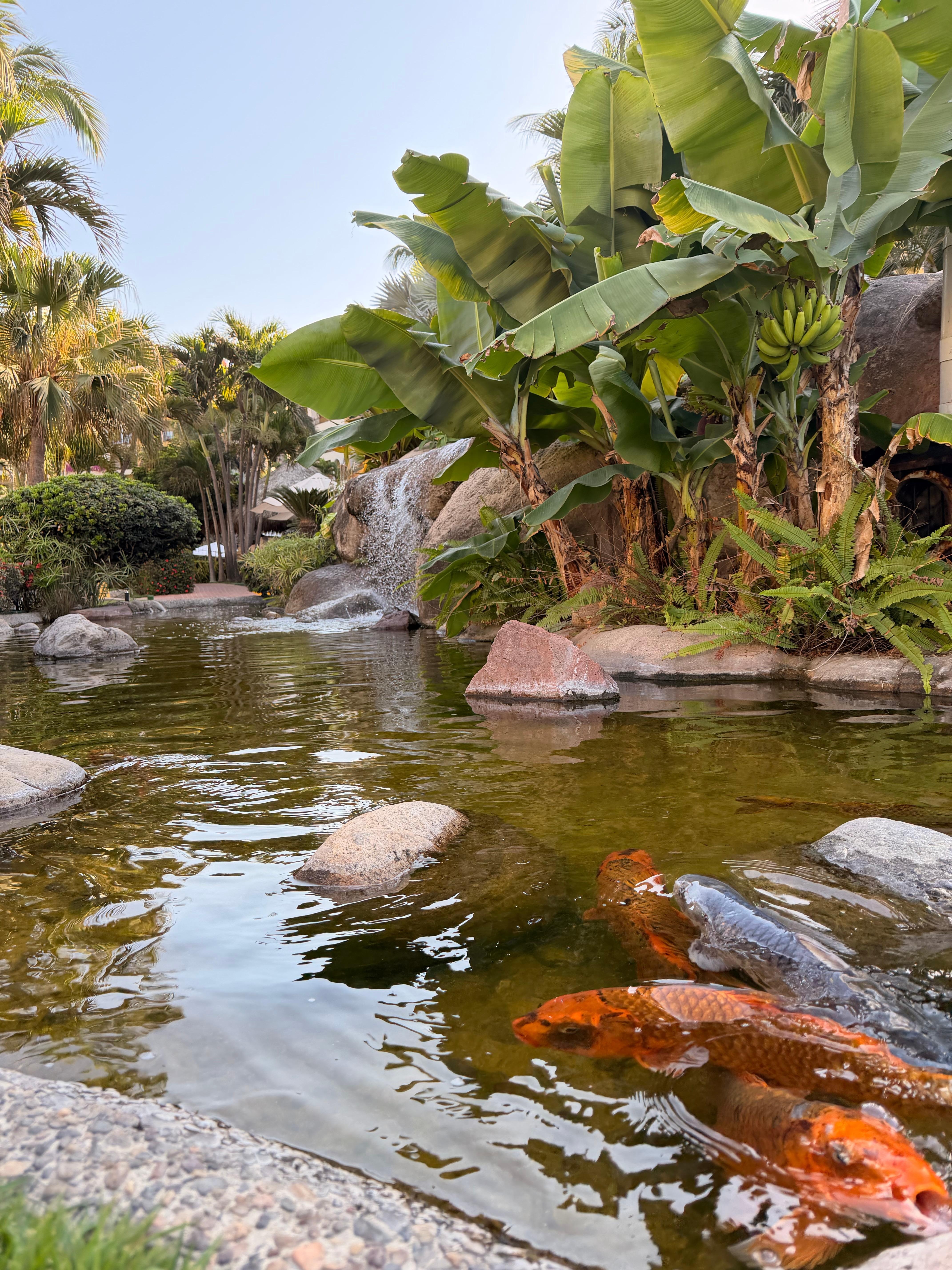 The grounds are spotless and incredible, there are Koi fish rivers scattered throughout, and you can feed the fish with food purchased from the shop. The plants are beautiful and well tended. The three pools are fantastic and clean and connected via a lazy river.