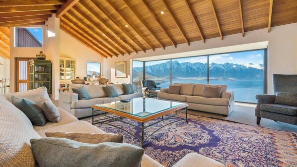 Inloopniveau: groot en ruim, Ibon House maximaliseert zijn spectaculaire uitzicht op de baai van Queenstown en de bergen met kamerhoge ramen in de lounge. Een stenen schouw met openhaard biedt een heerlijke sfeer na een dag skiën. Keuken en eetkamer op dit niveau, genieten van het geweldige uitzicht, samen met een wasserette en een apart toilet.