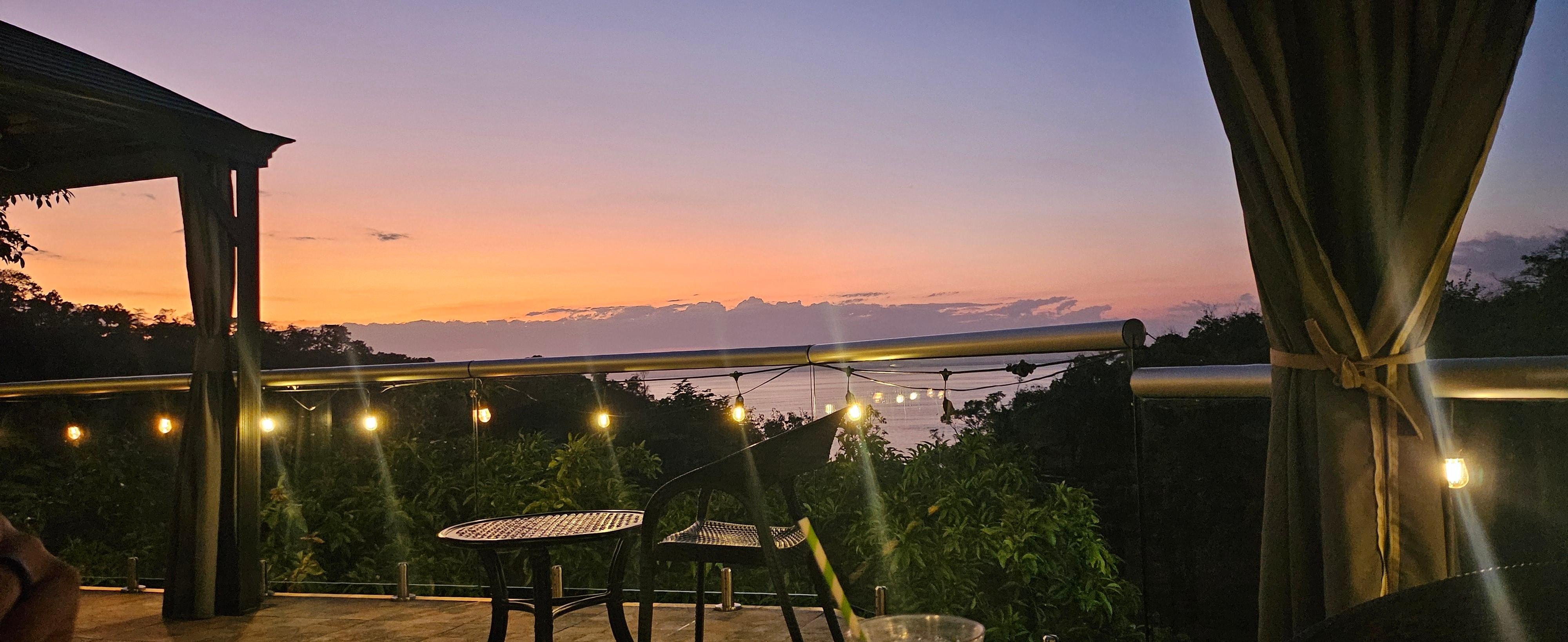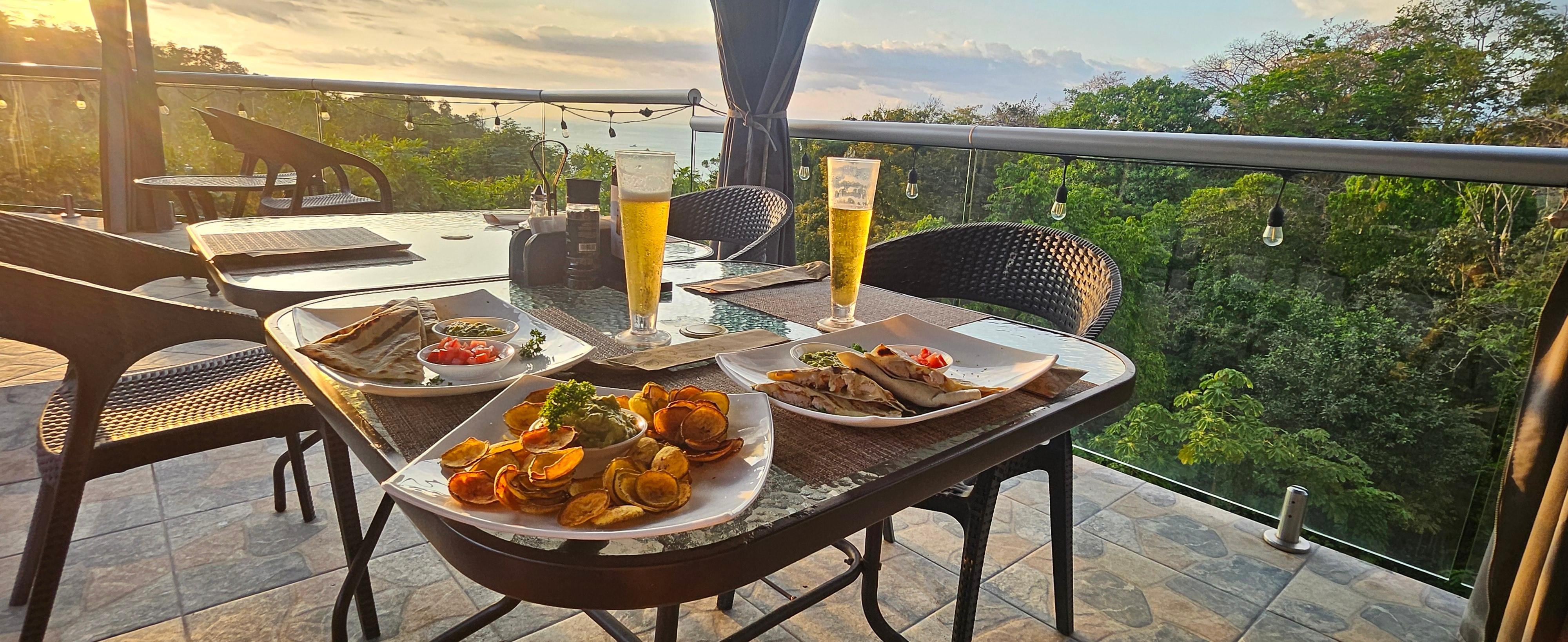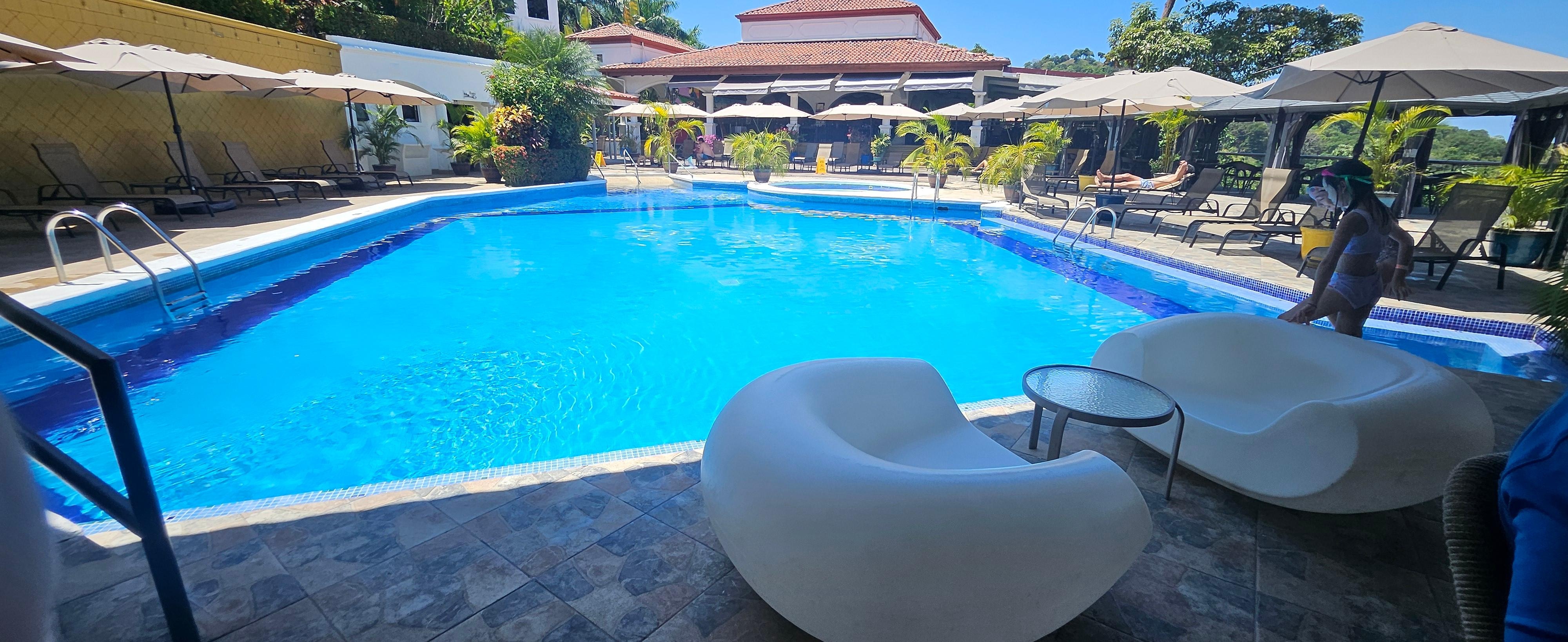 The ocean was visible from the restaurant and pool. Great food at the restaurant. We had the Tico Roll, hamburger, Hawaiian pizza cooked in a wood fire oven and a chicken wrap. All were splendid. Excellent choices at the breakfast buffet. Lovely maintained pool with a bar that had a happy hour. The only drawback was the steep walk to our room, to the beach or to get to the main road which was a km away. It didn't bother us but if you don't like a challenge grab a can. Rides in a golf cart we're provided if needed. Beach was excellent but wear swim shoes because of the lovely lava rock. Plenty of restaurants within the km. The staff was extremely friendly. So happy with our choice.