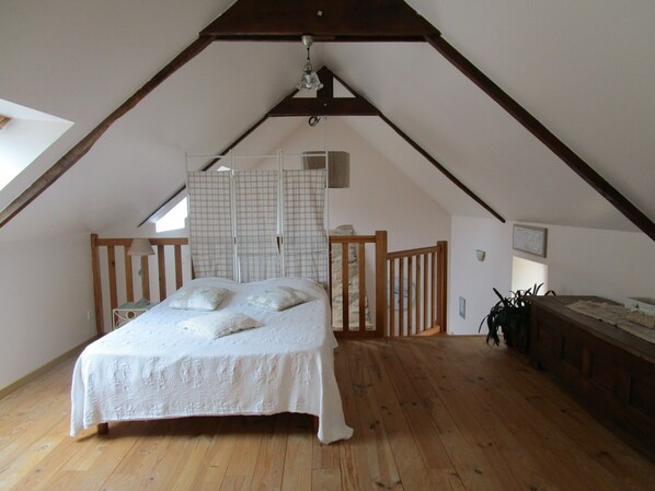 Eerste verdieping = een slaapkamer (1 dubbel), met uitzicht op de woonkamer en open haard en een slaapkamer (2 singles). De toegang tot de 2e slaapkamer is aan de overkant van de mezzanine.