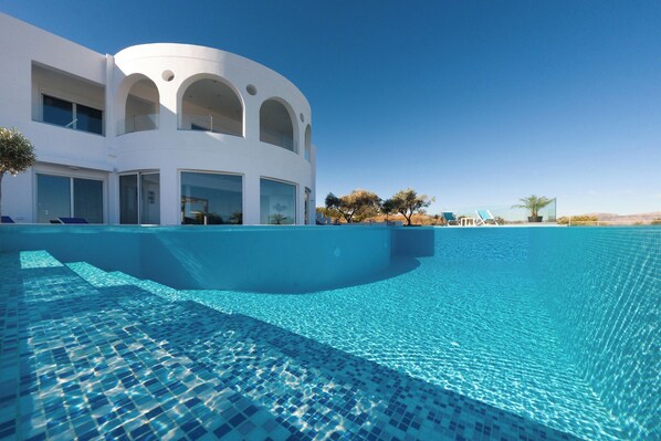 Villa Zoe Blu offers spacious living with luxurious comforts, making it feel like home. The villa has 9 bedrooms in total: 4 on the upper floor and 5 on the pool level. On the upper floor, there are 4 bedrooms with king-size beds, two of which have ensuite bathrooms. The pool level has two king-size bedrooms and three rooms with two single beds in each, all with ensuite bathrooms. In total, there are 7 bathrooms, all equipped with showers--5 of which are attached to the bedrooms.