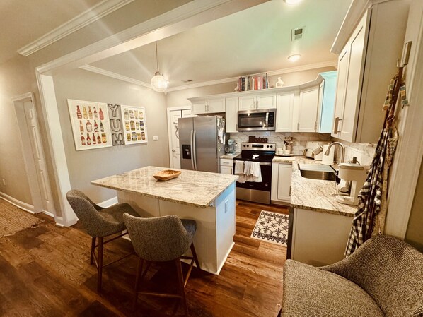 Gourmet Kitchen: Whip up your favorite meals in the fully-equipped kitchen, complete with stainless steel appliances, ample counter space, and all the cookware you need. Enjoy your meals in the elegant dining area or step outside to the private patio for al fresco dining.