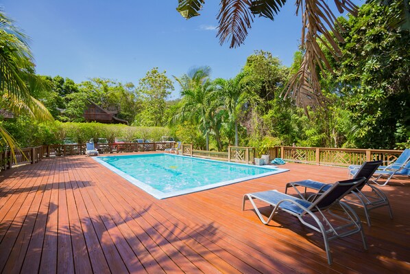 The island style cabana is nestled in a beautifully landscaped jungle canopy setting to keep the home cool and breezy. The beach front includes a private 300 ft pier accessible only by Sundancer guests. The has an upper deck for sunning, and shaded palapa over the water.
