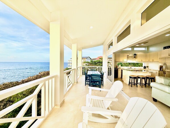 Unwind in the spacious living area, where retractable glass panels seamlessly blend indoor and outdoor living with a 20-foot-wide oceanfront, immersing you in the sights and sounds of paradise. Step onto your private terrace, sip a cocktail, and take in breathtaking panoramic ocean views as the sun melts into the horizon.