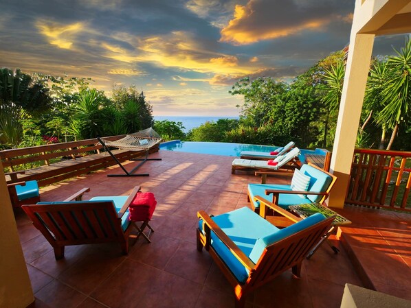 Als u graag kookt, heeft de volledig uitgeruste gastronomische keuken een groot eiland van leisteen en Hondurese palissander, een eetbar, twee eetzalen en een spectaculair uitzicht op het Caribisch gebied. De afgeschermde veranda bij het zwembad heeft een zithoek, een bar en yoga- en fitnessapparatuur.